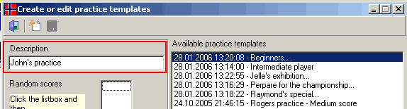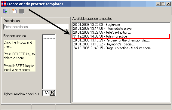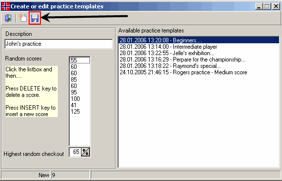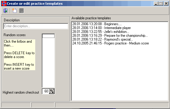 Be sure not to set it to high... If you take a look at my sample in the picture below, you can see that I have entered the same score more than once. The reason for this is simply that it increases the possibility to pick the fex. 60 score more often than 125... Remember to save the template by clicking on the button with the diskette icon. The new template will now be visible in the list box on the right side. The template is now ready to be used. ![]()