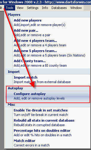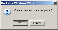 One of the nicest things about Darts for Windows 2008, is the option to play against the computer (autoplay). If you are a top level player or just loves to play darts, playing against the computer is a very good way to practice. All the scores you enter in a autoplay template will be picked randomly by the computer and thats the good thing! You will never know what score comes next, but you can control it in some way by entering the maximum random outshot and the scores the computer will pick at random. When you install the program for the very first time, 6 templates are installed. The name of the templates are "Beginners","Intermediate player","Jelle's exhibition...","Prepare for the championship...", "Raymond's special..." and "Rogers practice - Medium score". The "Beginners" template includes the following scores: 26,26,26,30,38,41,45,45,55 and 60. The highest random outshot in this tempate are 40 points. This level is rather easy for the average player, because it often plays with an average of 14.00-16.00 pr. dart. For some players this level is too easy. If you don't want to use one of the other templates, you can create your own template... To create a new template (or level if you like) go to the "Tools" menu and click on "Configure autoplay" (se picture below). ![]()