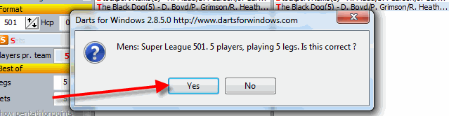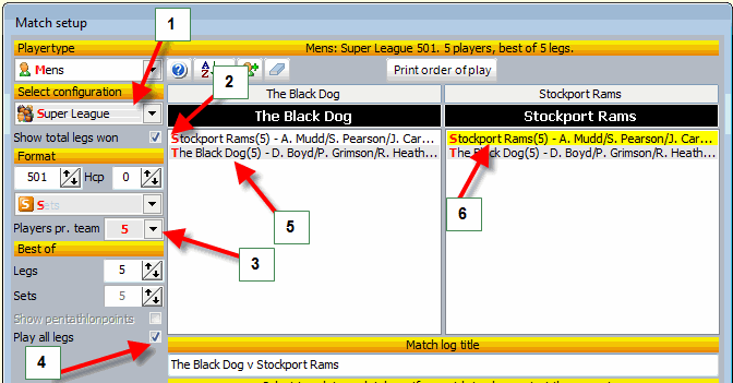 of players pr. team to 5, check the "Play all legs" if you are playing all legs in the set/match and then select the home and away team