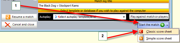 Start the match as shown below (please note that the format above is only available in "Classic score sheet" mode.