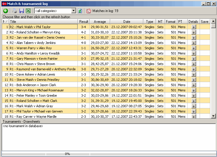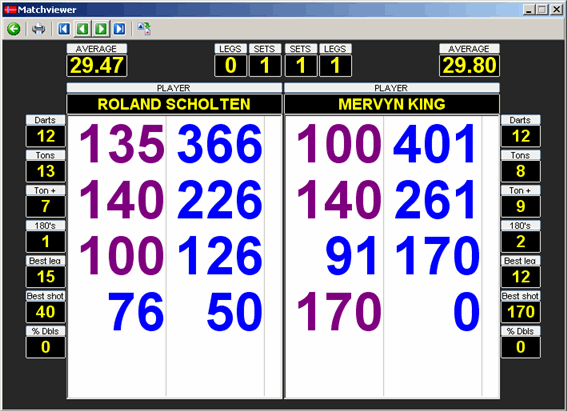 When doubleclicking on a match, the "Matchviewer" window will pop up and show all the legs in that match starting from the first leg. This sample picture is taken from the 1st leg in the second set in the Ladbrokes.com WDC second round match between Netherlands Roland Scholten and Englands Mervyn King. To browse through the different legs, click on the navigation buttons in the upper left corner of the window. As you can see, it's also possible to print out all the legs in scoresheet style (one leg each page).