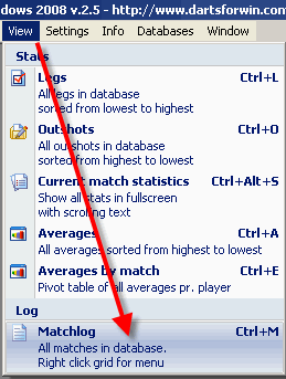 To view all scores and stats for a match, go to the menu "View" and click on "Matchlog" (se picture below).